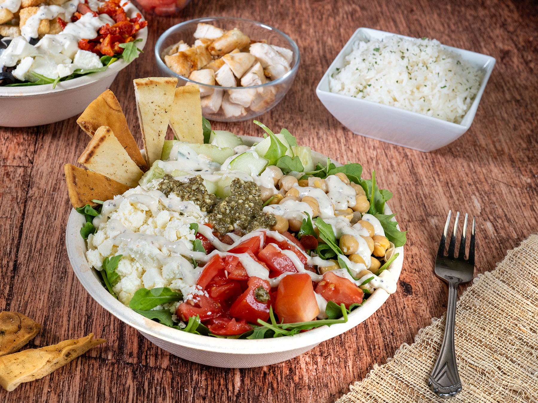 Make it a Bowl, a Salad, or Wrap it Arugula, chickpeas, tomatoes, cucumber, feta cheese, pita chips, caesar and pesto dressings. Suggested add-ons: Jasmine rice