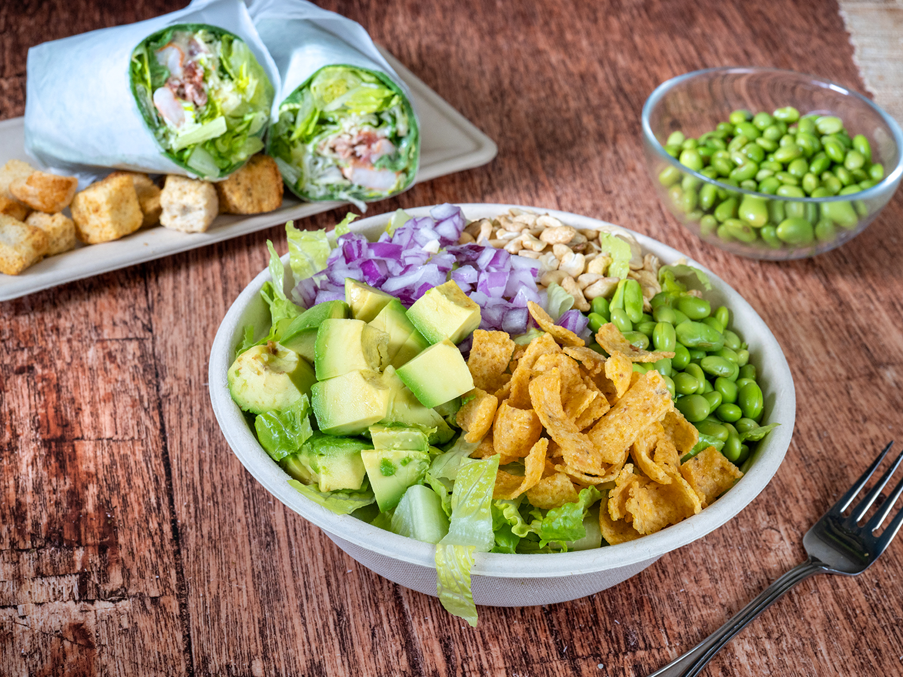 Make it a Bowl, a Salad, or Wrap it Romaine lettuce, edamame, cashews, red onions, avocado, tortilla strips and dill pickle dressing*. Suggested add-ons: Quinoa