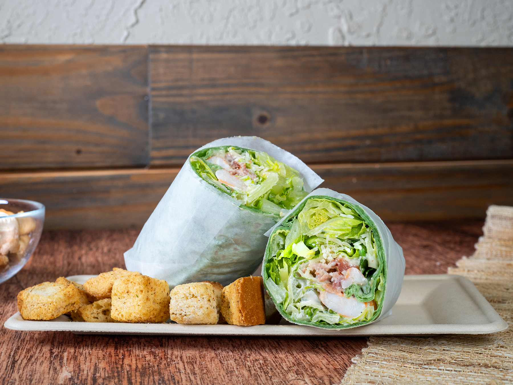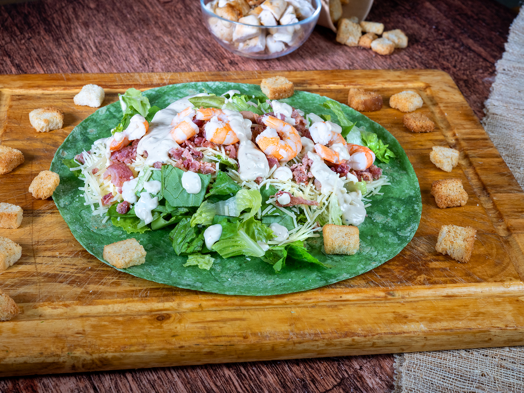 Make it a Bowl, a Salad, or Wrap it Romaine lettuce, parmesan cheese, bacon, shrimps, classic croutons and table side ceaser dressing. Suggested: Wrap it!