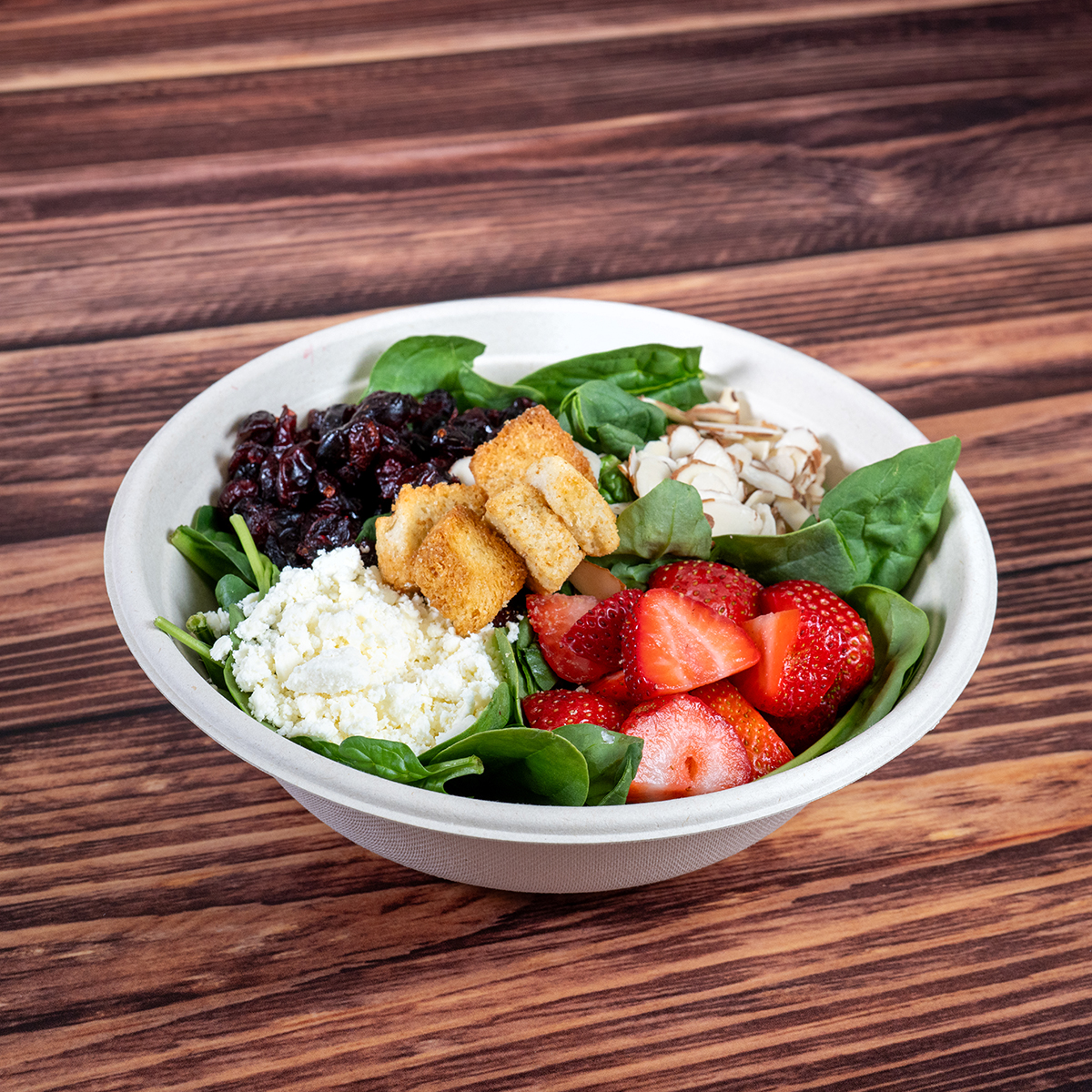 Make it a Bowl, a Salad, or Wrap it Spinach, strawberries, feta cheese, dried cranberries, almonds, classic croutons, creamy raspberry and blue cheese dressings. Suggested