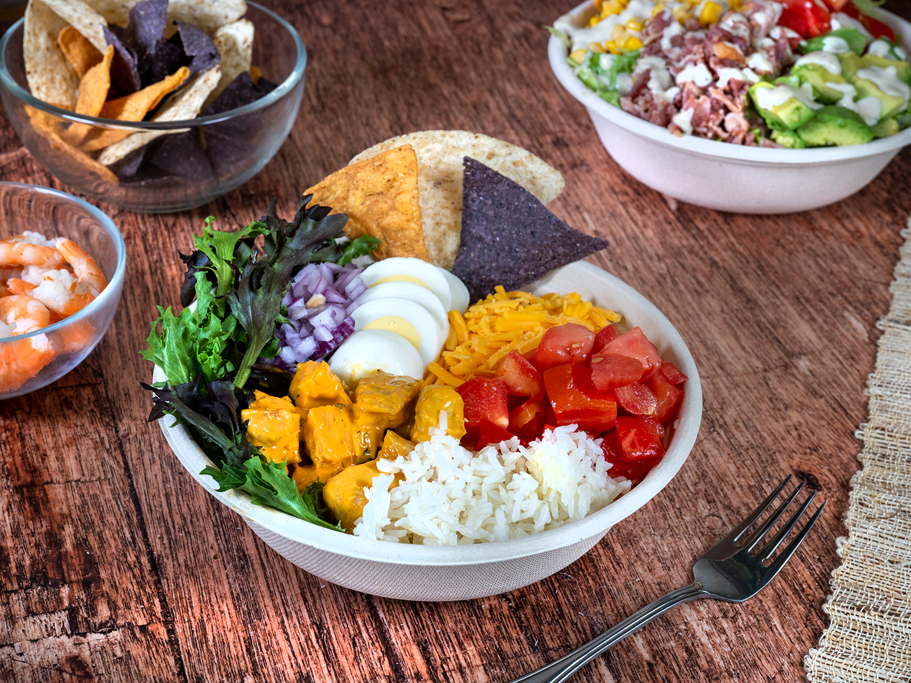 Make it a Bowl, a Salad, or Wrap it Romaine lettuce, tomatoes, corn, bacon, avocado, tortilla strips and avocado ranch dressing. Suggested add-ons: jasmine rice
