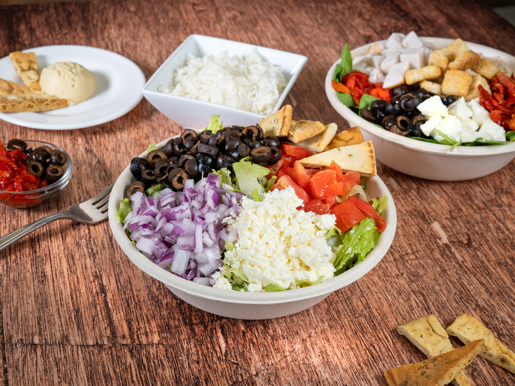 Make it a Bowl, a Salad, or Wrap it Arugula and spinach, brown rice, red pepper, black olives, mozzarella cheese, sundried tomatoes, turkey, classic croutons,